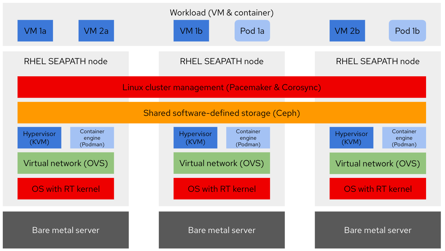 Whether you follow the opinionated implementation from SEAPATH, or use a fully supported approach by Red Hat, the high-level architecture in the following diagrams is exactly the same. SEAPATH comes with implementation designs for single nodes, two nodes with an observer, or a three-node hyperconverged setup, and Red Hat's products allow for other configurations. This could mean more flexibility for storage solutions (for example, integrating external iSCSI storage instead of Ceph), and network topologies without attached cluster nodes for further scalability. With industry demand, such patterns can also be contributed to SEAPATH.