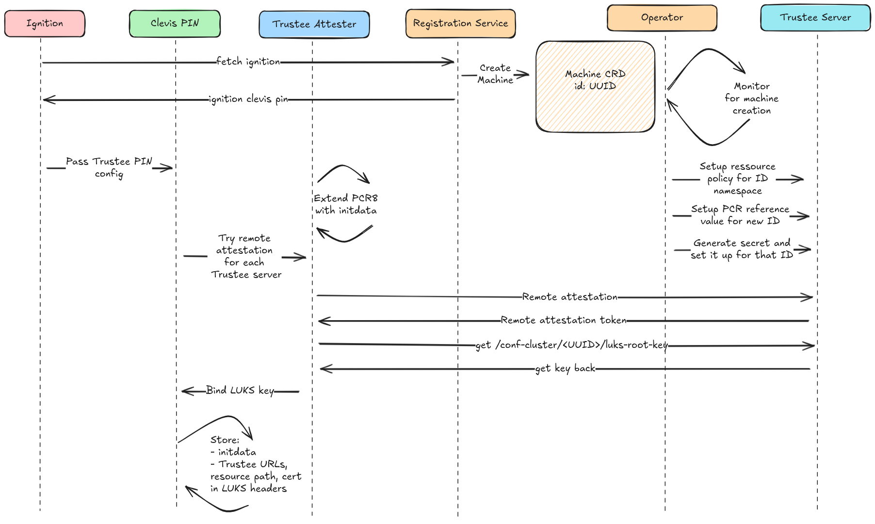 Meanwhile, the operator monitors for new machine objects. When it sees one, it generates a new secret, registers it with the Trustee, and updates the attestation and resource policy with UUID-specific rules.