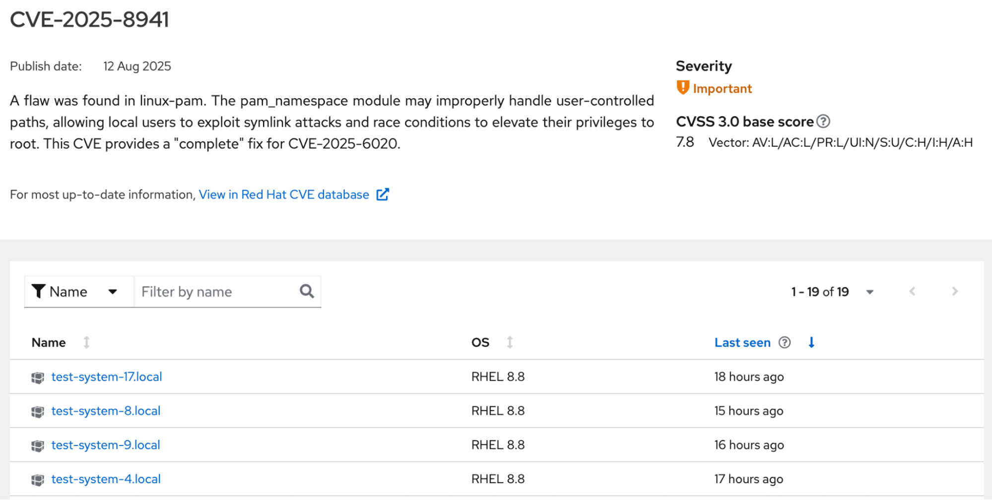 Select the CVE ID to see details, including the list of affected systems and a link to the CVE entry in the Red Hat CVE database. In fully disconnected environments, you will need to copy the CVE database link and open it on a connected system, or use the Red Hat Offline Knowledge Portal.