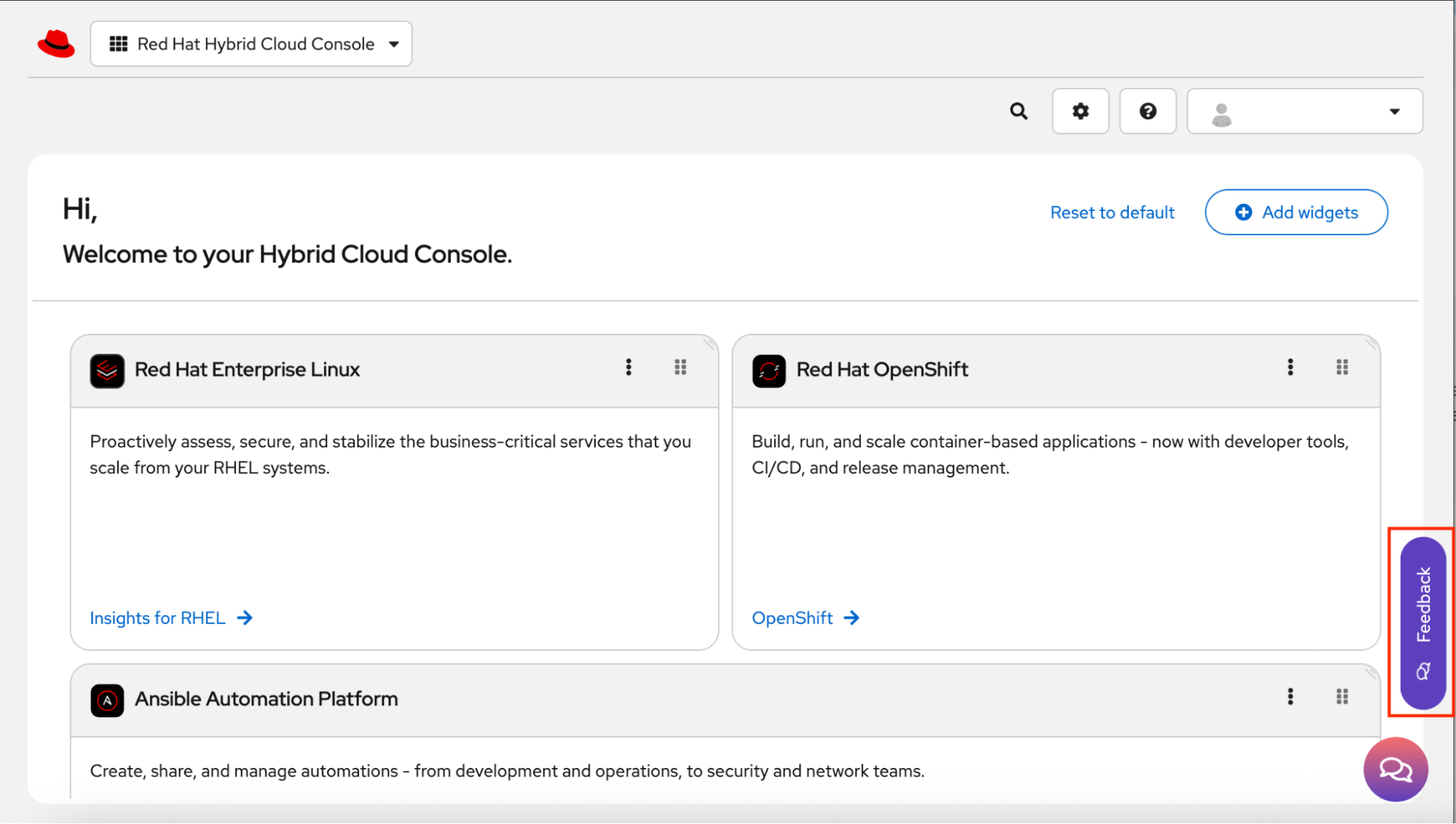 To provide feedback, visit the Red Hat Hybrid Cloud Console and select the Feedback button in the lower-right corner of the screen (Figure 8).