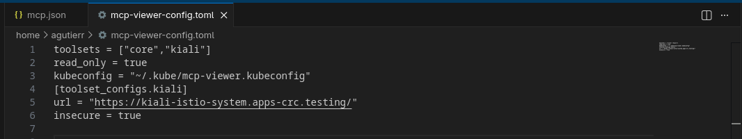 Unlike the standard setup where you just run the binary, enabling Kiali requires a TOML configuration file. This is where we explicitly tell the server to load the Kiali toolset (Figure 1).