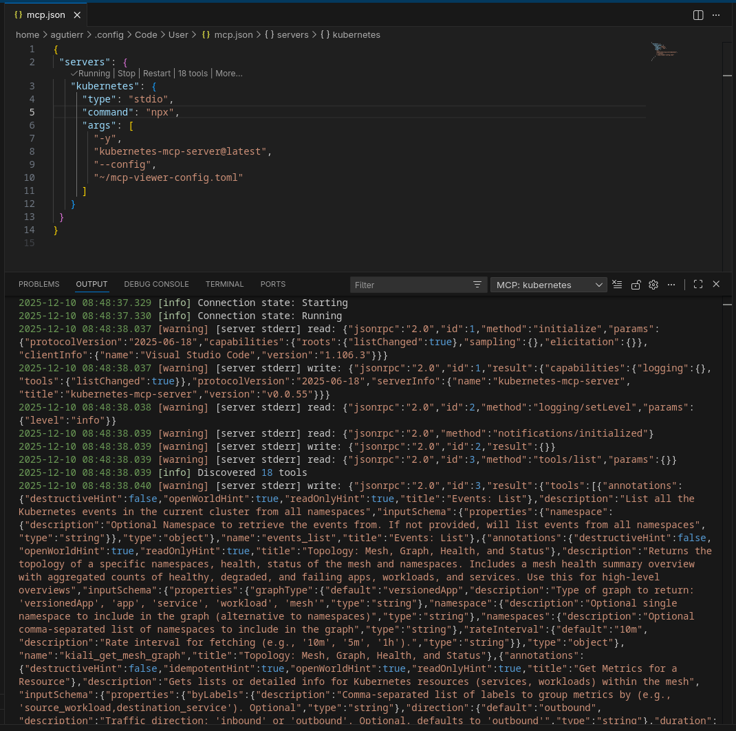 You now have a file named mcp-viewer.kubeconfig in your current directory. We will use this to authenticate the MCP server.
