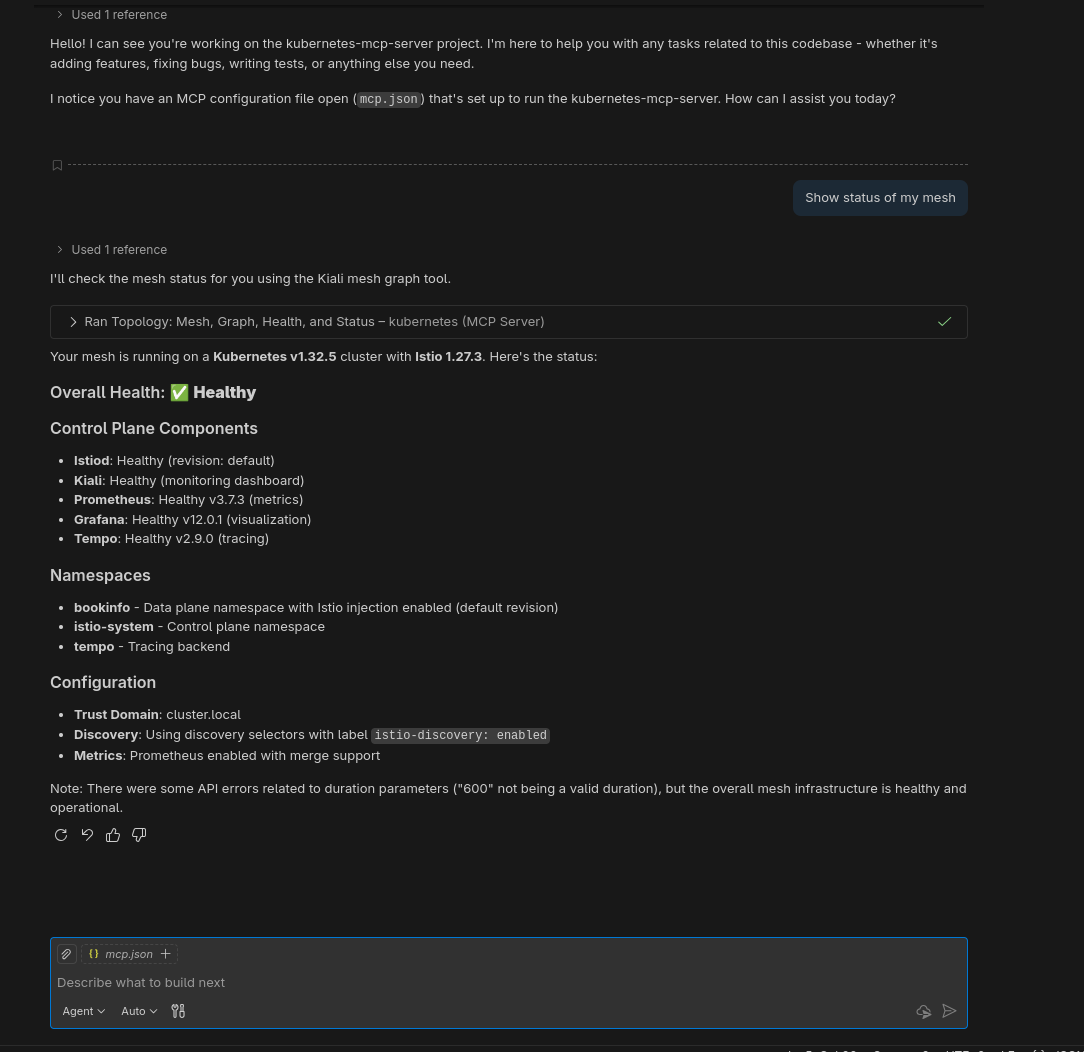 If you’ve been following the rise of the Model Context Protocol (MCP), you might have seen the recent buzz around managing Kubernetes clusters using AI assistants like Claude Desktop or Cursor. While the core abilities of the Kubernetes MCP Server (managing pods, deployments, and logs) are impressive, there is a hidden feature introduced in version 0.0.55: service mesh integration. The project recently added support for Kiali, the management console for Istio. This means now you can let your AI agent inspect your traffic flow, troubleshoot microservices, and analyze mesh metrics, all through natural language.