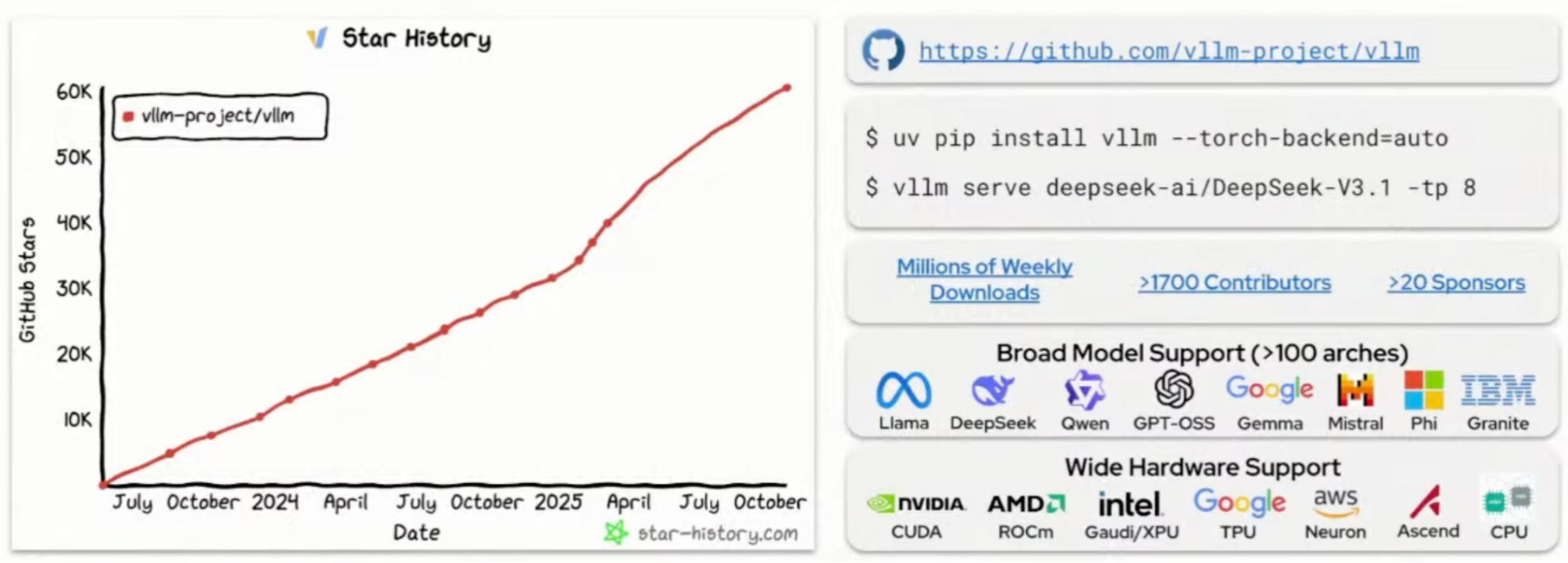 ramalama run gpt-ossvLLM is suited for large-scale inference with concurrent users and repeated requests where caching is useful. A UC Berkeley project now with Red Hat as the main corporate contributor, it supports "any model, on any accelerator, on any cloud." It's also the top open source project by contributors for GitHub in 2025 (Figure 11).