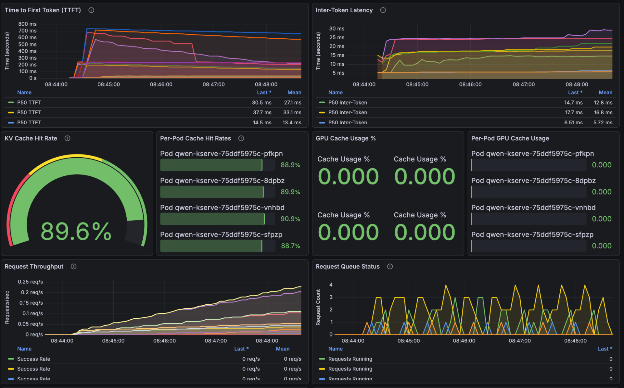 We'll keep a Grafana dashboard open throughout the process to monitor TTFT, KV cache hit rate, GPU utilization, and throughput.