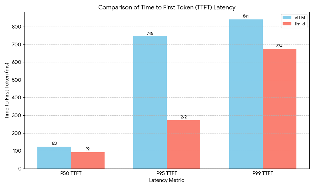 - P50 TTFT of 92 ms (25% faster than vLLM) shows that llm-d improves everyday responsiveness for most users.