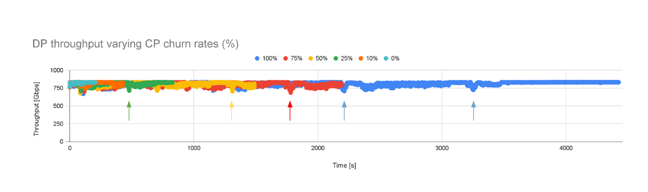 The cyan line serves as a baseline when no churn is applied to the CP workload. There, we see that the throughput is barely affected and achieves ~830 Gbps on average and consistently. However, as we start churning, we notice that the churn level (%) does impact the throughput.
