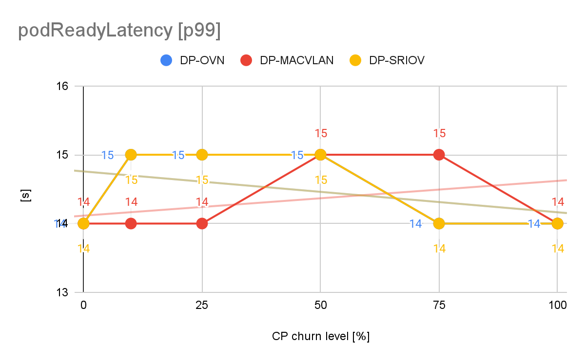 Also, we found that the churn level had a slight influence on the pod readiness latency, with 2.23s with churn 0% and 2.46s with churn 100% for the DPDK pods, an increase of 10.3%.