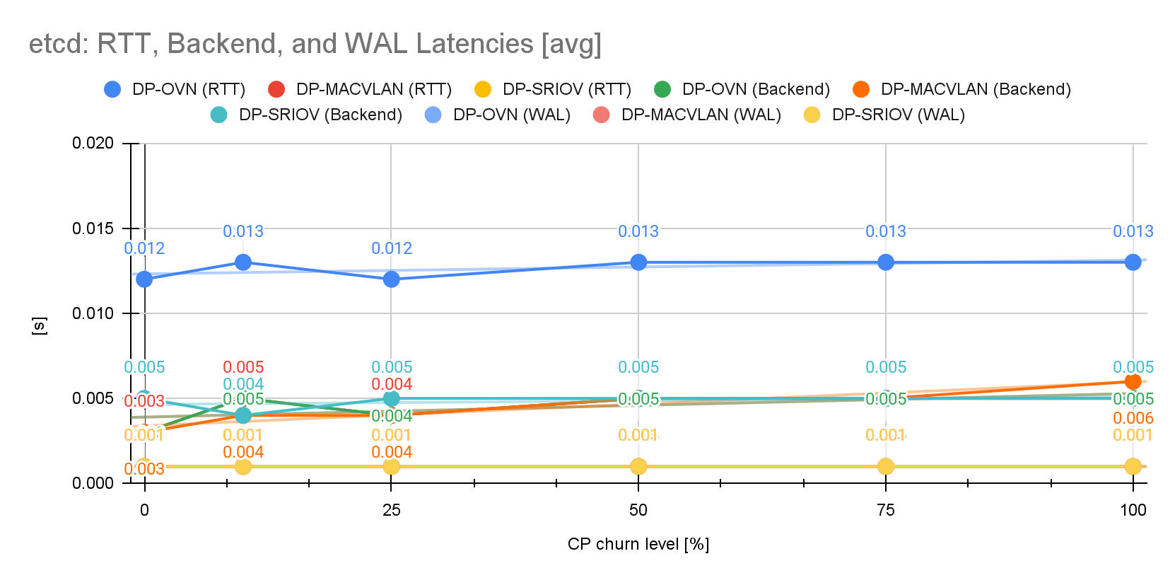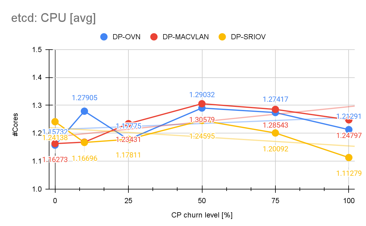 However, if we look at etcd’s resource consumption and latencies, etcd demonstrates remarkable stability as the control plane churn level varied from 0% to 100%: We observe that etcd’s latencies (WAL, backend and RTT) across all churn configurations were barely affected and remained within acceptable key performance indicator (KPI) ranges. Etcd CPU consumption with DP-OVN remained relatively low and stable.