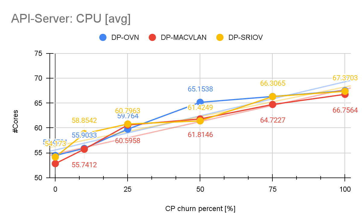 During our measurements with DP-OVN the API server exhibits an increase of 24% in the CPU consumption while memory consumption was barely affected. For API server read-only (RO) and mutating latencies, the DP-OVN configuration stayed nearly consistently below and around 40ms between churn 0% and 100%, which we can also confirm in the DP-MACVLAN and DP-SRIOV scenarios (Figure 10).