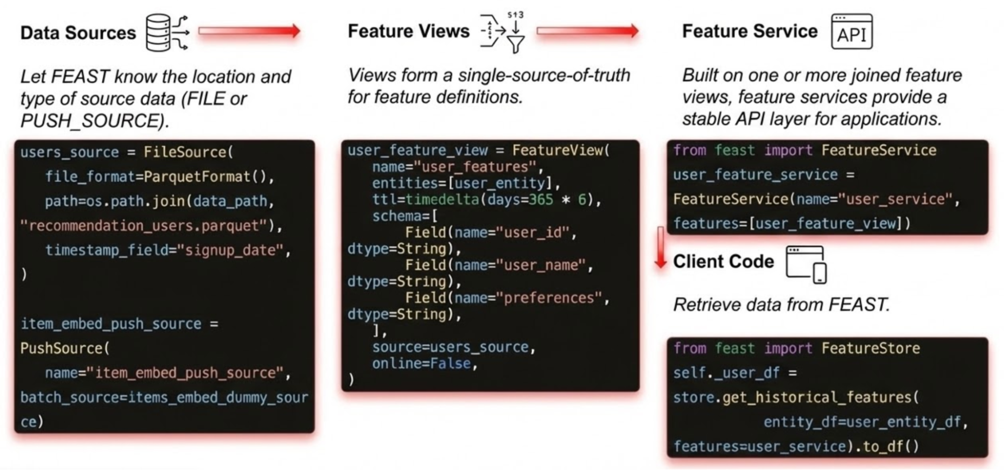 Feast also provides a unified Python API for working with feature data through concepts like data sources, views and services. Figure 2 depicts the following usage pattern our AI quickstart uses: