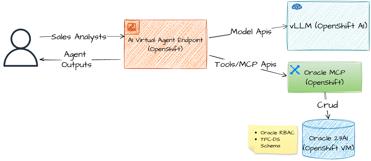 OpenShift is where you deploy your AI applications (AI Virtual Agent in our example). OpenShift AI is where you can deploy your LLMs using GPU nodes while an Oracle MCP server on OpenShift connects your AI application to an existing Oracle database.