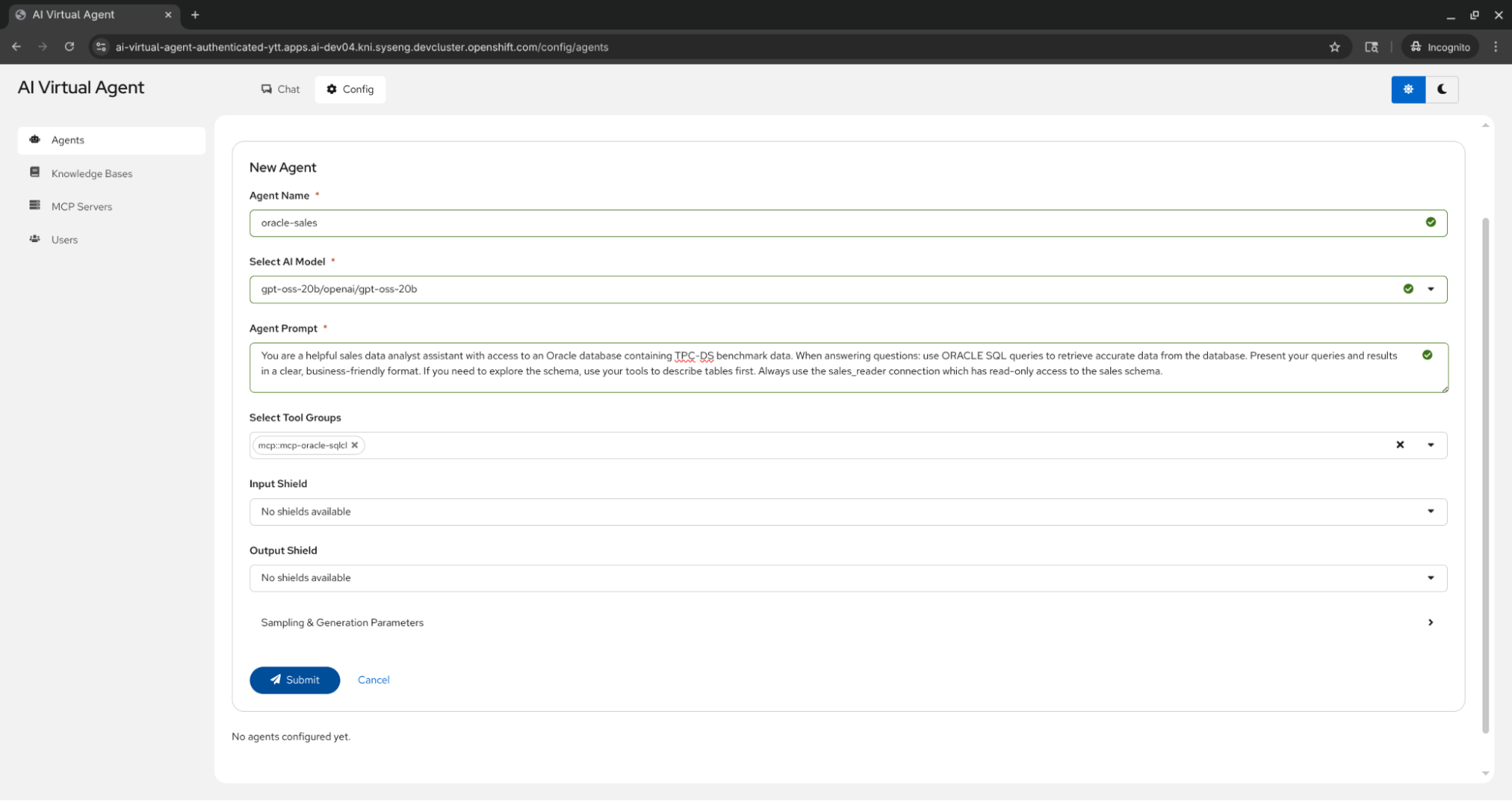 To showcase this integration, we will use the AI Virtual Agent demo application. This demo shows how to use OpenShift and OpenShift AI to build an immersive AI agent builder on a secure Kubernetes cluster. While OpenShift AI provides the AI infrastructure, OpenShift is the application platform where you can deploy and scale the AI agents in your environments just like with any microservice. To ensure only authorized and authenticated users access the database, we use both Oracle-native RBAC and OpenShift container platform security primitives. The local MCP server is deployed as an OpenShift container exposing the remote Streamable-HTTP interface.