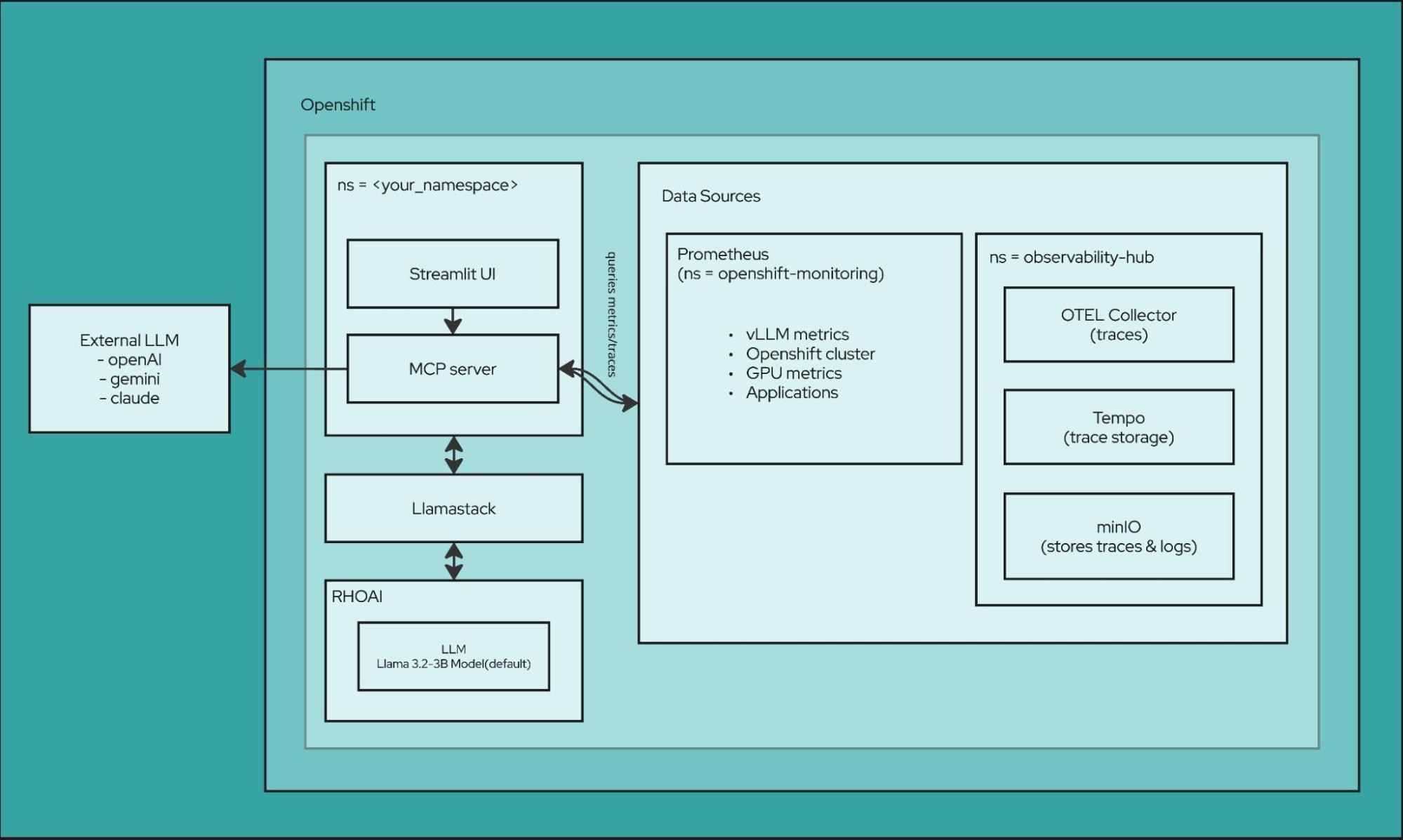 A team of Red Hatters, including Sandip Gahlot, Jianrong Zhang, Abdul Hameed, Manna Kong, and myself, created an AI quickstart to transform complex infrastructure monitoring into an intelligent, conversational experience. Built specifically for Red Hat OpenShift AI environments, this quickstart provides true root-cause visibility into your AI workloads and the underlying Red Hat OpenShift cluster. It goes beyond basic metrics by leveraging an LLM-powered analysis engine, which uses Korelt8r to seamlessly correlate the four pillars of observability: real-time metrics, logs, traces, and alerts. This integrated approach ensures you get clear, actionable insights through natural language interactions.