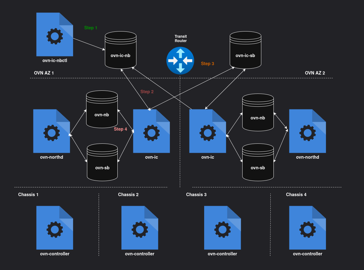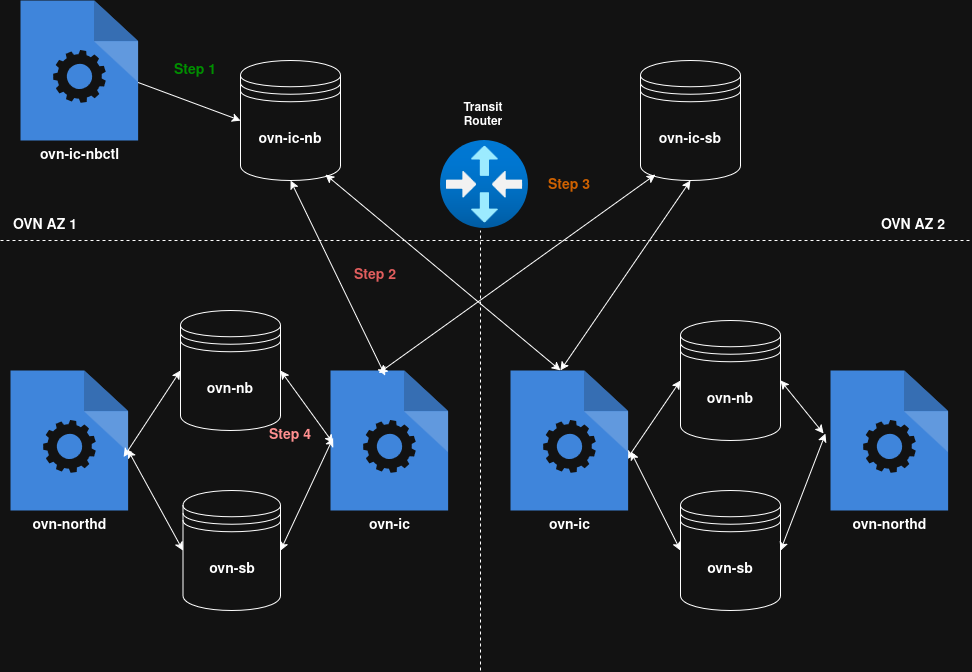 ovn-ic-nbctl. - The OVN-IC daemon in each AZ monitors IC-NB for updates.