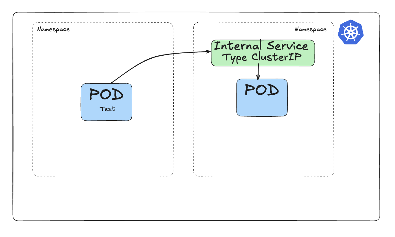This diagram shows a Pod (on the right-hand side) served by an internal ClusterIP Service in green, linked by a selector. Communication from another Pod (called Pod Test) will route via the internal Service to reach the target Pod.