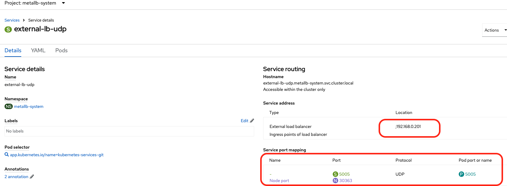 Similarly, we can see that external-lb-udp has an IP address of 192.168.0.201 (the 192.168.0.0/24 is the external network our test system is running on) and is doing a 5005/UDP to 5005/UDP port mapping towards the udp-pod.