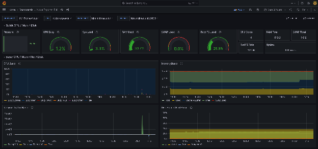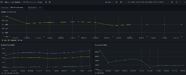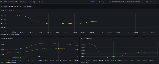 Latency StdDev (s): 0.001976The same general behavior observed in the UDP tests applies here. The test begins with an initial burst reaching approximately 93k QPS, with the first few intervals showing higher throughput than the rest. After approximately 40 seconds, performance stabilizes, a pattern visible in the Grafana dashboard shown in Figure 6: