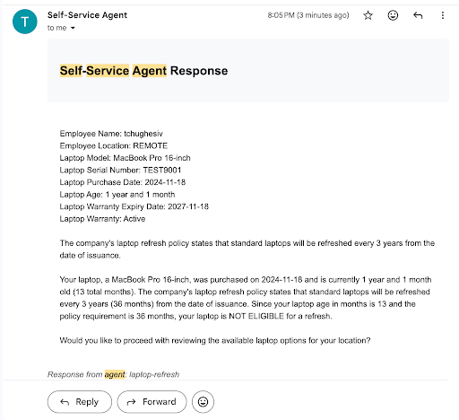 The IT self-service agent AI quickstart connects AI with the communication tools your team already uses, including Slack, email, and ServiceNow. This post explores how the agent handles multi-turn workflows—such as laptop refreshes or access requests—across different channels.