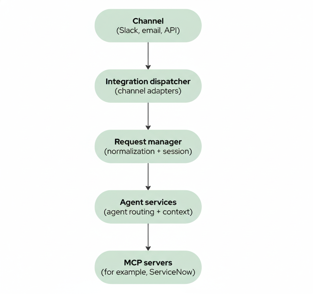 At a high level, every interaction flows through the same core path as shown in in Figure 1. The request begins at a channel—such as Slack or email—and passes through an integration dispatcher using channel adapters. From there, it moves into a request manager for normalization and session handling, then through agent services for routing and context, before finally reaching the MCP servers (such as ServiceNow).