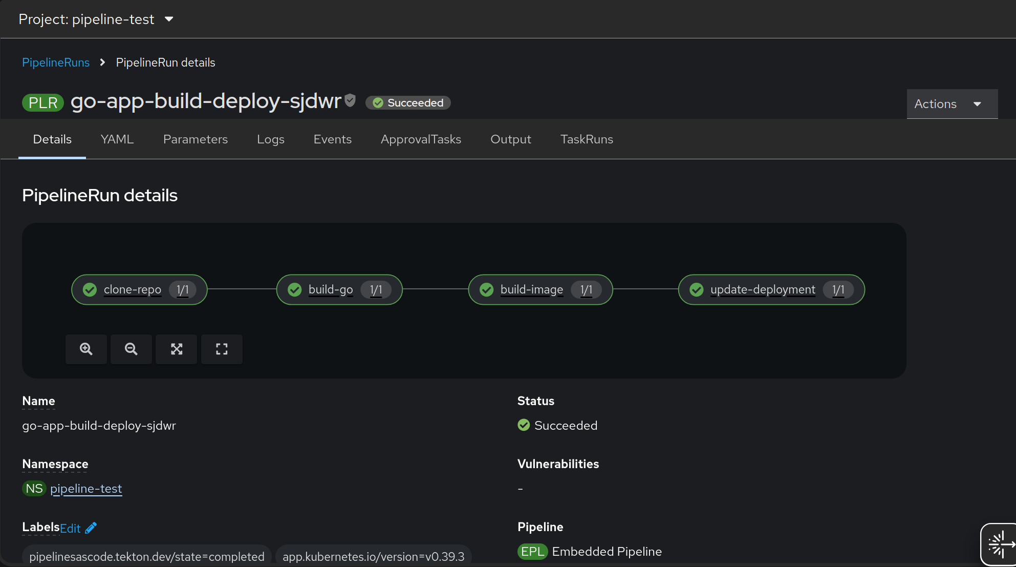 When you push code to the main branch, the pipelines-as-code controller detects the event and automatically executes this PipelineRun to clone your repo, compile the Go binary, and build a new container image.