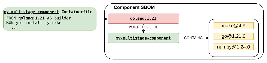 golang:1.21 BUILD_TOOL_OF my-multistage-componentbuilder-intermediate DESCENDANT_OF golang:1.21golang:1.21 CONTAINS go@1.21.0builder-intermediate CONTAINS make@4.3my-component CONTAINS numpy@1.24.0