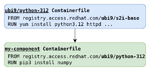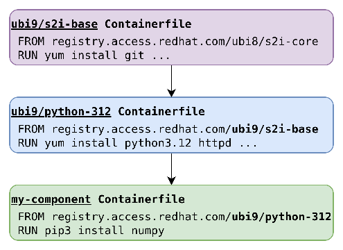 To demonstrate the difference between content sourced from a parent image and content installed during a build, consider Figure 1 extended into a three-level image chain, as shown in Figure 2, which captures the ancestor of the ubi9/python-312 - ubi9/s2i-base image.