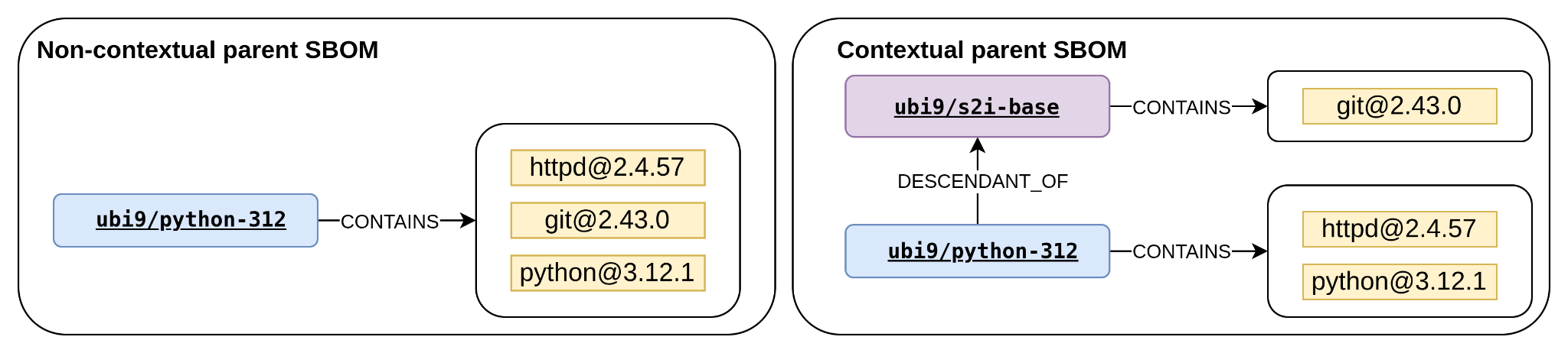We cannot always count on the presence of the contextual SBOM in the parent's repository. If the downloaded parent SBOM is not contextual (see Figure 4, on the left), then we can still set up the parent package and DESCENDANT_OF relationship with a component, and track the component's packages up to this parent. If no parent SBOM exists in the registry, then we can generate it locally and execute the same process.