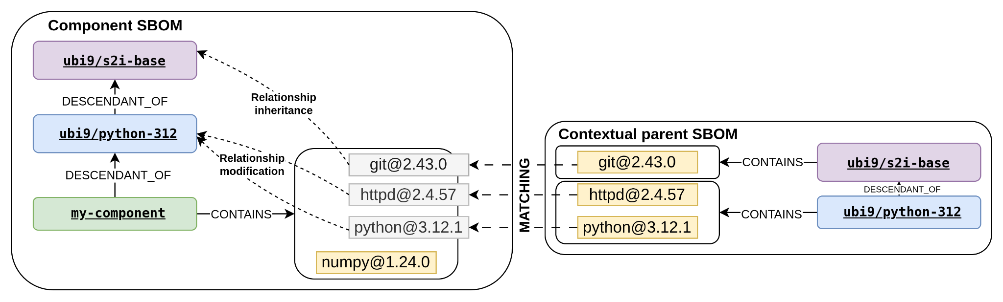 ubi9/python-312 CONTAINS httpd@2.4.57ubi9/python-312 CONTAINS python@3.12.1my-component CONTAINS numpymy-component DESCENDANT_OF ubi9/python-312