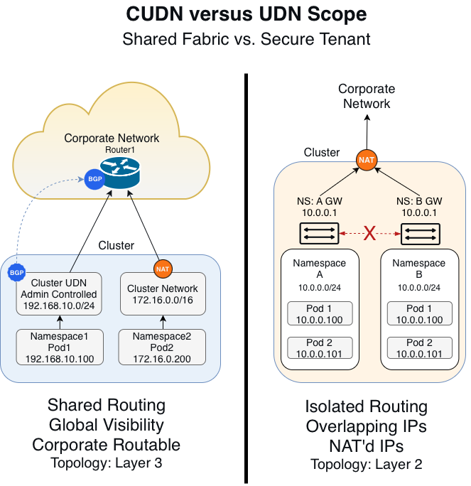 To implement this standards-based architecture, it is critical to use the right tool for the job. OpenShift 4.18+ uses two powerful custom resource definitions (CRDs) of networks with different scopes and purposes. Figure 1 illustrates a comparison of CUDN versus UDN.