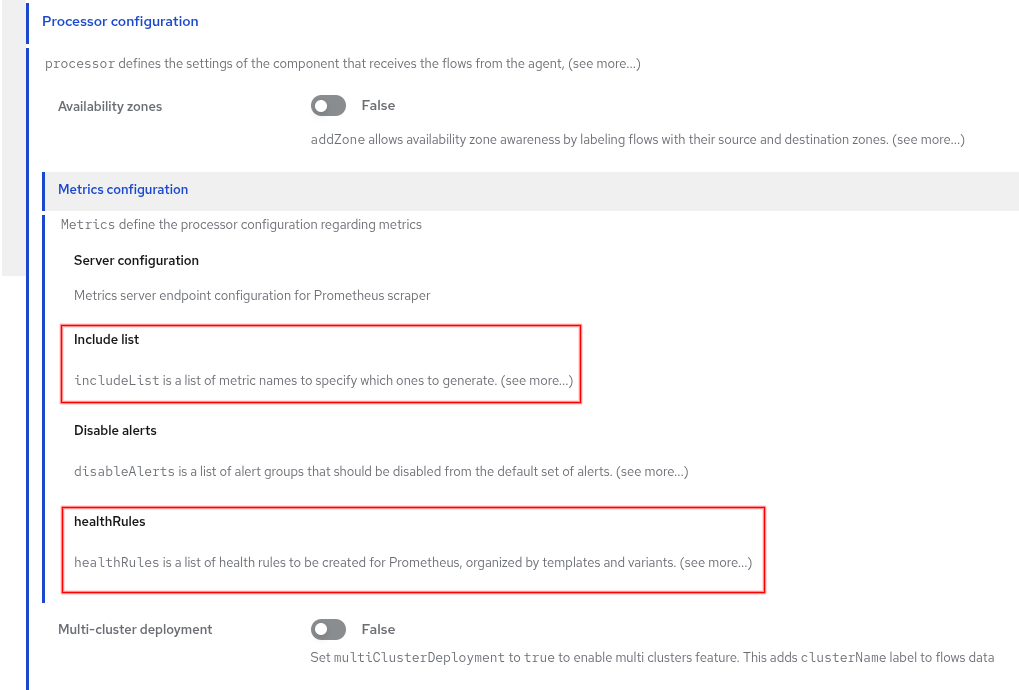 In the OpenShift web console and the FlowCollector form, click Processor configuration and then Metrics configuration. The two relevant sections are: include list and healthRules (Figure 6).