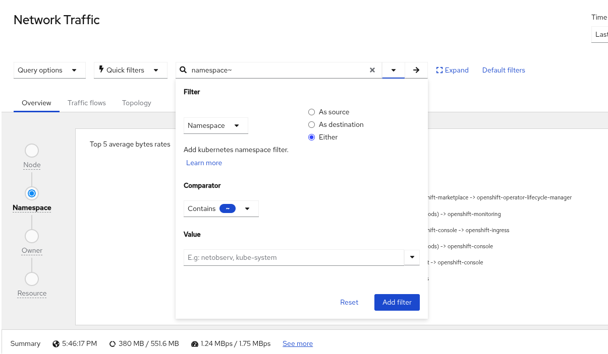 enable: trueWhat makes this really powerful is that you can configure the FlowCollector to ingest data only for a list of namespaces. Here is an example to ingest data for namespaces named webapp or begin with openshift-.
