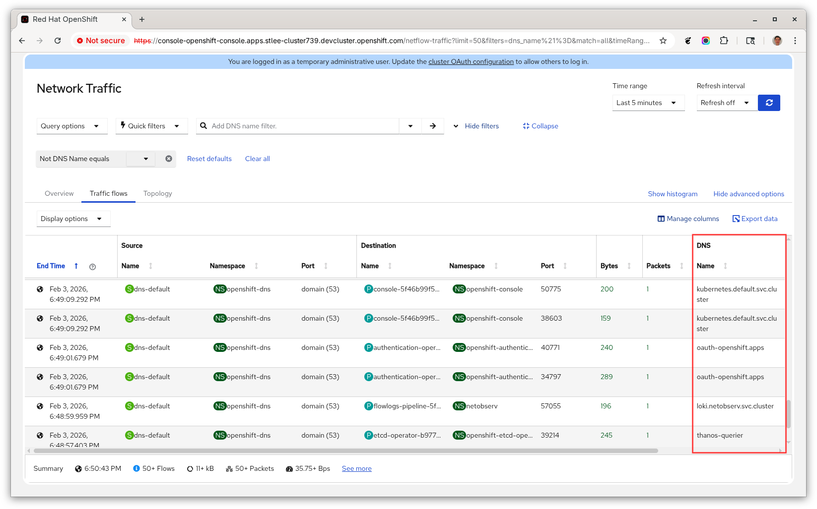 - DNSTrackingIt now retrieves the DNS name. Technically, in a DNS query, it is the QNAME field. In the OpenShift web console, go to Observe > Network Traffic and click the Traffic flows tab. Click Show advanced options and then Manage columns. Scroll down and enable DNS Name to add this column. Now you will see this column in Figure 3.