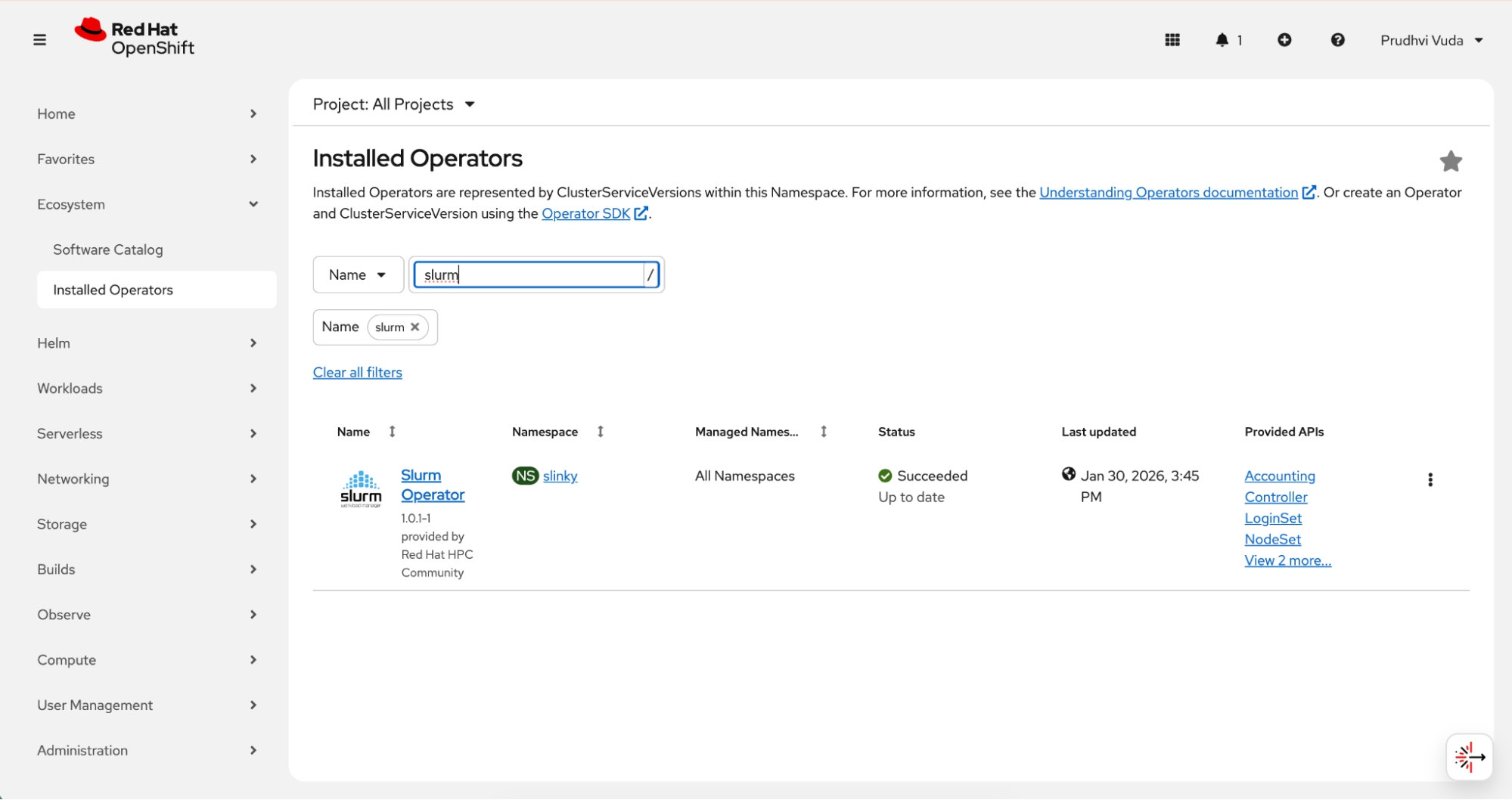 Navigate to Ecosystem → Installed Operators, filter by the slinky namespace, and confirm that the Slurm Operator shows a "Succeeded" status.