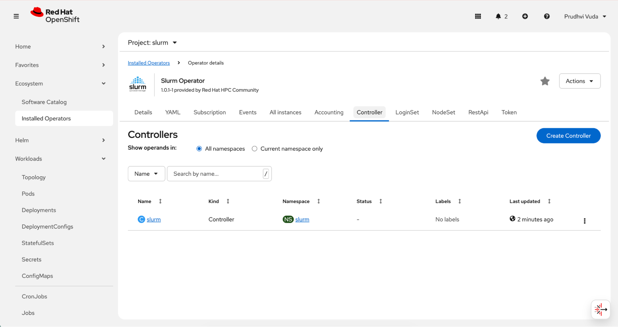 Create the controller: With the secrets in place, you can now create the Slurm controller, which acts as the central job scheduler. Navigate to Ecosystem → Installed Operators, filter by namespace, and click on the Slurm Operator.