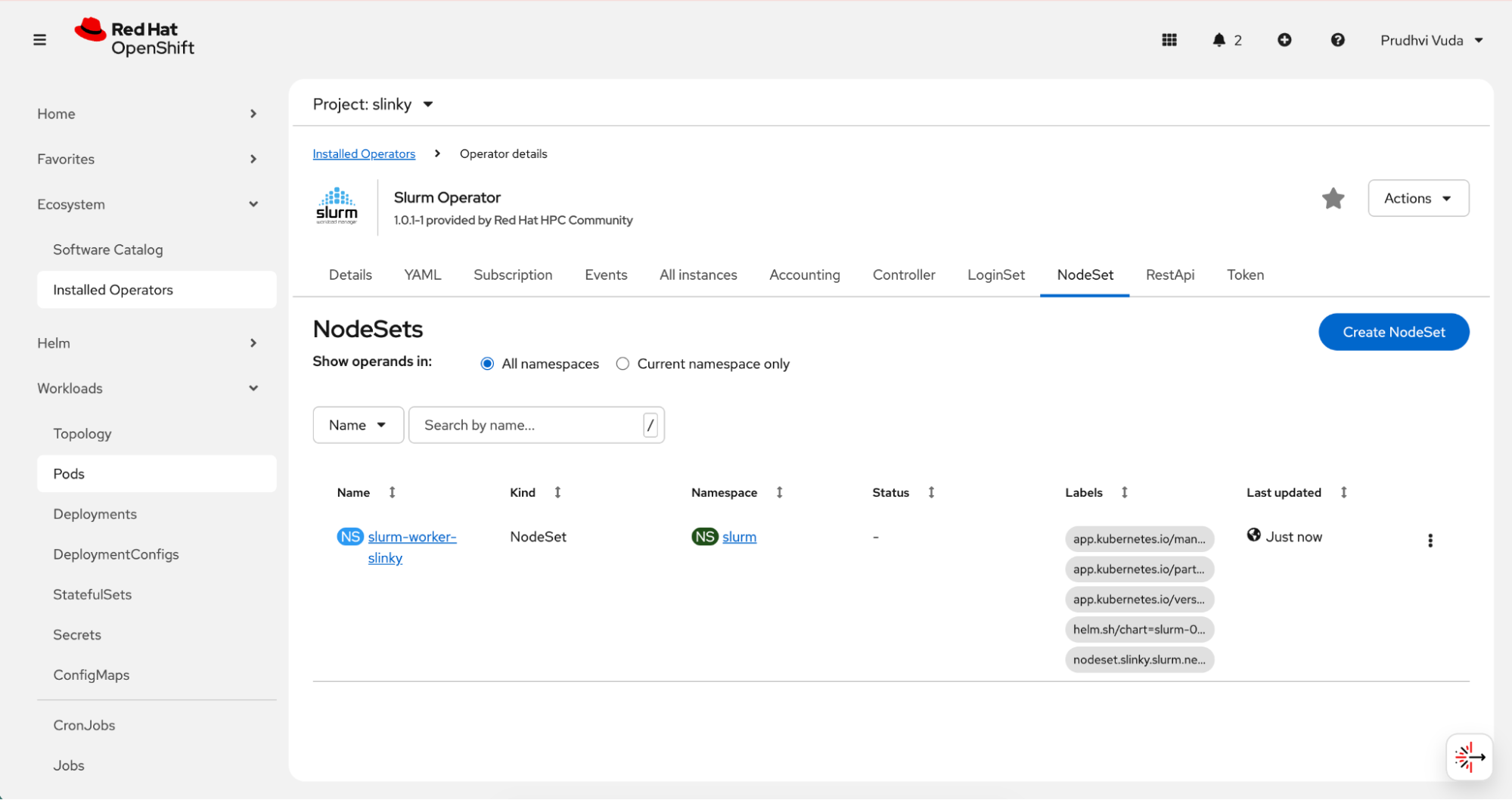 Navigate back to the Slurm operator in Installed Operators, find the NodeSet resource type, and click Create NodeSet.