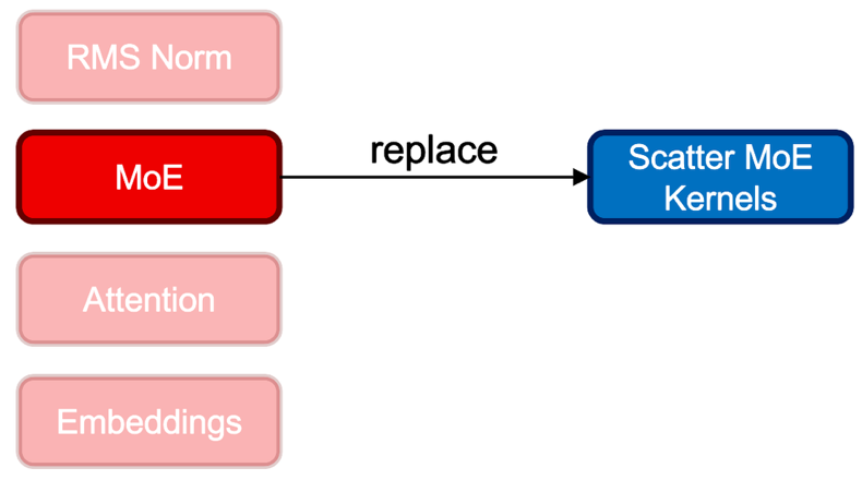 When you use fms-hf-tuning, it performs a drop-in replacement of an existing MoE module with scatter mode kernels, while keeping the parameter composition intact. This optimization aims to provide training GPU memory savings and throughput enhancement. Specifically, for the Granite 4.0 MoE class of models, the GraniteMoeHybridMoE module is replaced with kernels and corresponding experts (input_linear and output_linear), and router weights are mapped. Upon training, learned weights are mapped back to GraniteMoeHybridMoE, and the original architecture is maintained. This feature can be activated by setting the fast_moe argument to True.