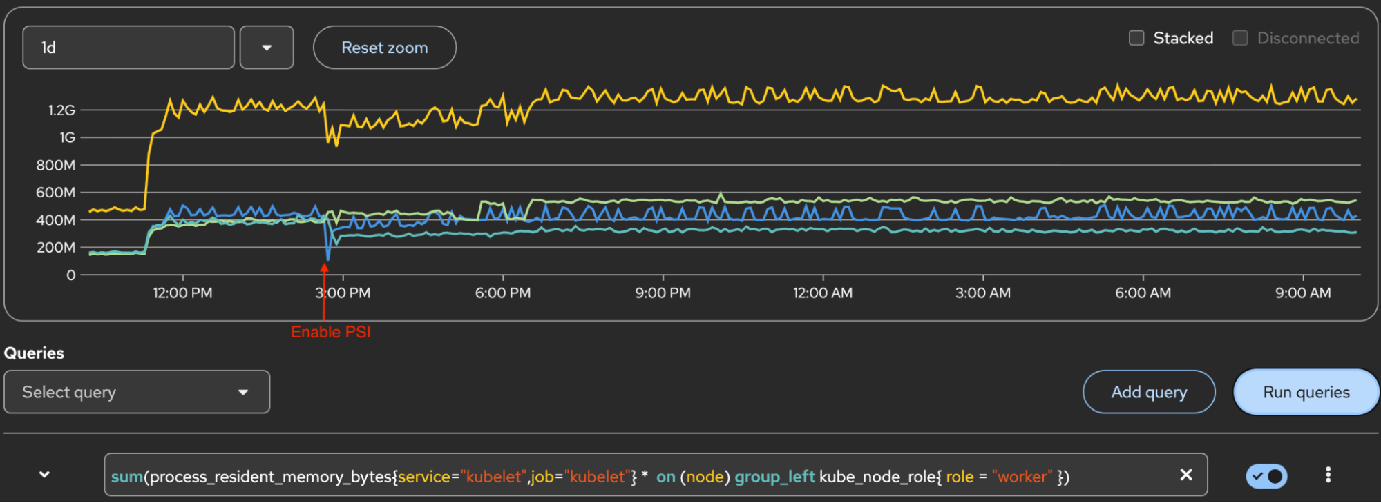 This article shares performance evaluation results for enabling PSI at scale. Enabling PSI has no observable impact on kubelet CPU or memory usage, but with PSI metrics collected at the node, pod, and container level, it does increase memory for Prometheus pods, and the impact grows with large container counts. On a cluster with 500+ test containers, enabling PSI causes Prometheus pod resident set size (RSS) to increase up to 1.3+ GB per Prometheus pod. That's a 42% increase from baseline memory consumption. Understanding the impact helps to plan cluster infrastructure resources before enabling PSI in production.