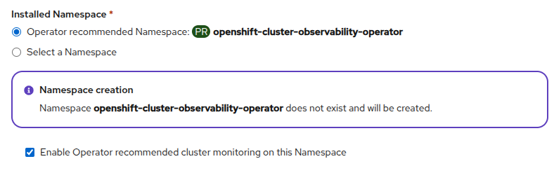 Figure 1: Enabling Operator recommended cluster monitoring during namespace creation. Create the monitoring UI plug-in using the following YAML definition: