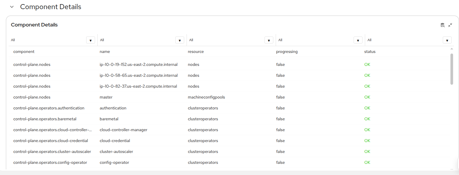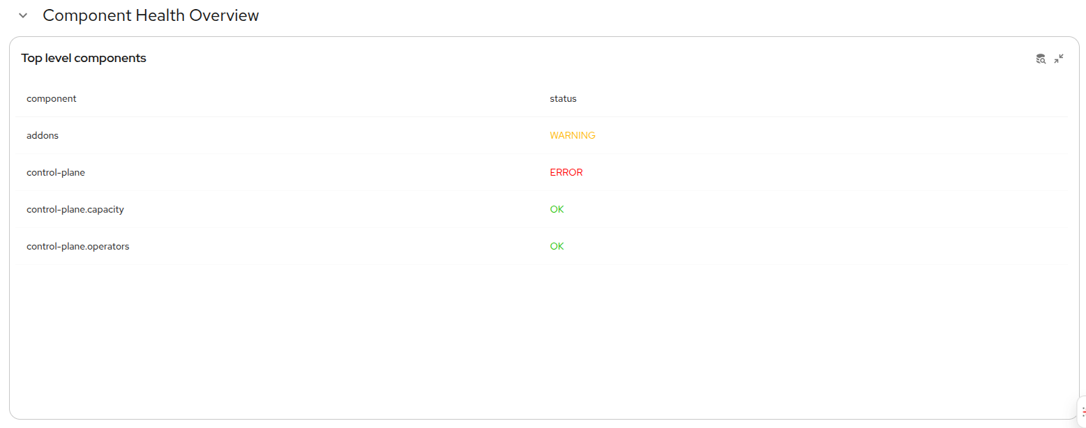 This overview helps you assess the status of the OpenShift control plane and other integrated components. This feature displays health information in a custom Perses dashboard and categorizes levels as OK, warning, and error. This categorization helps administrators quickly identify cluster components that require immediate attention. Component health was introduced in cluster-health-analyzer version 1.1 and is available in cluster-observability-operator 1.4 or later.