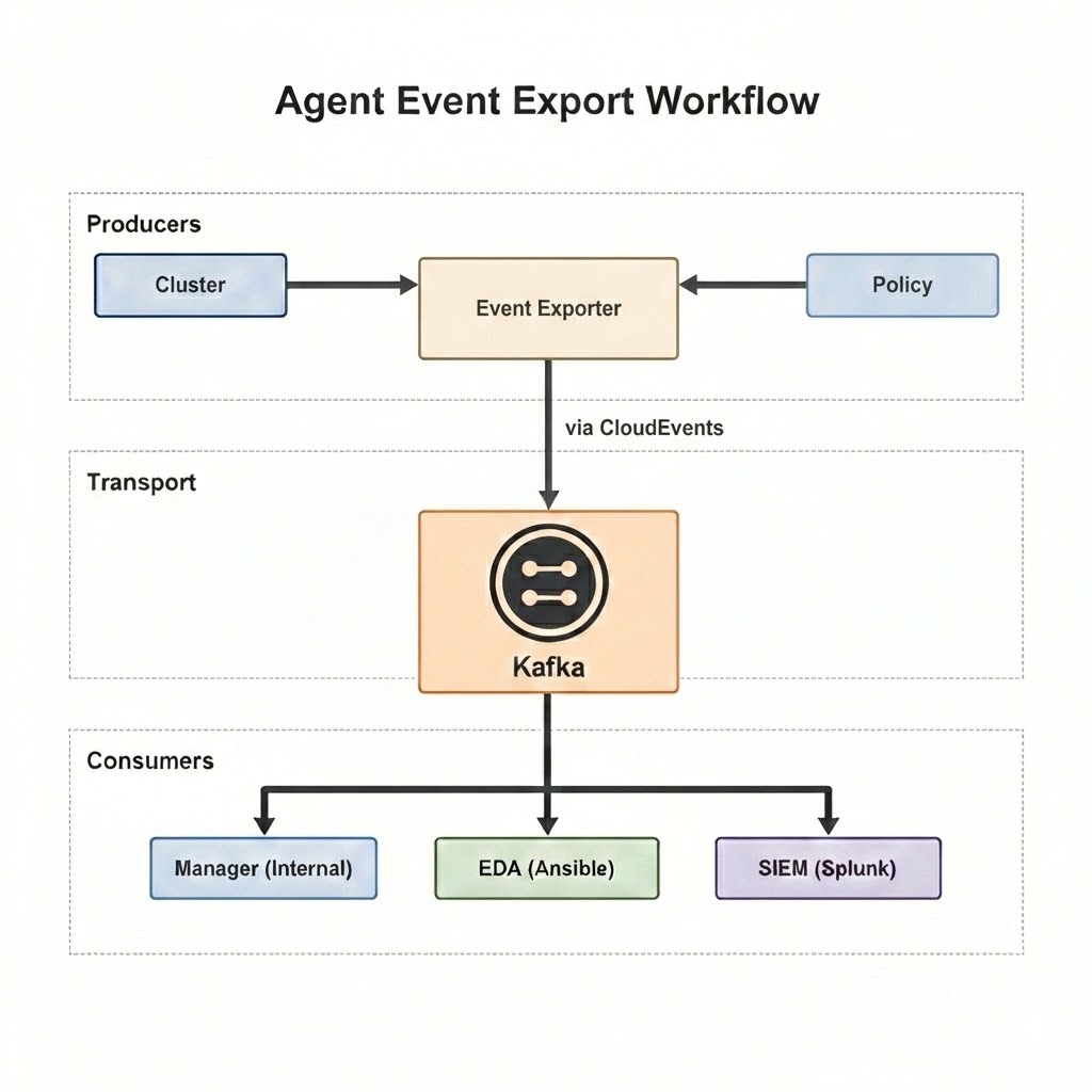 The multicluster global hub agent solves this by acting as an event exporter, collecting, standardizing, and publishing multicluster events as open streams that any enterprise system can consume, with the flexibility to extend to other custom resources as needed.