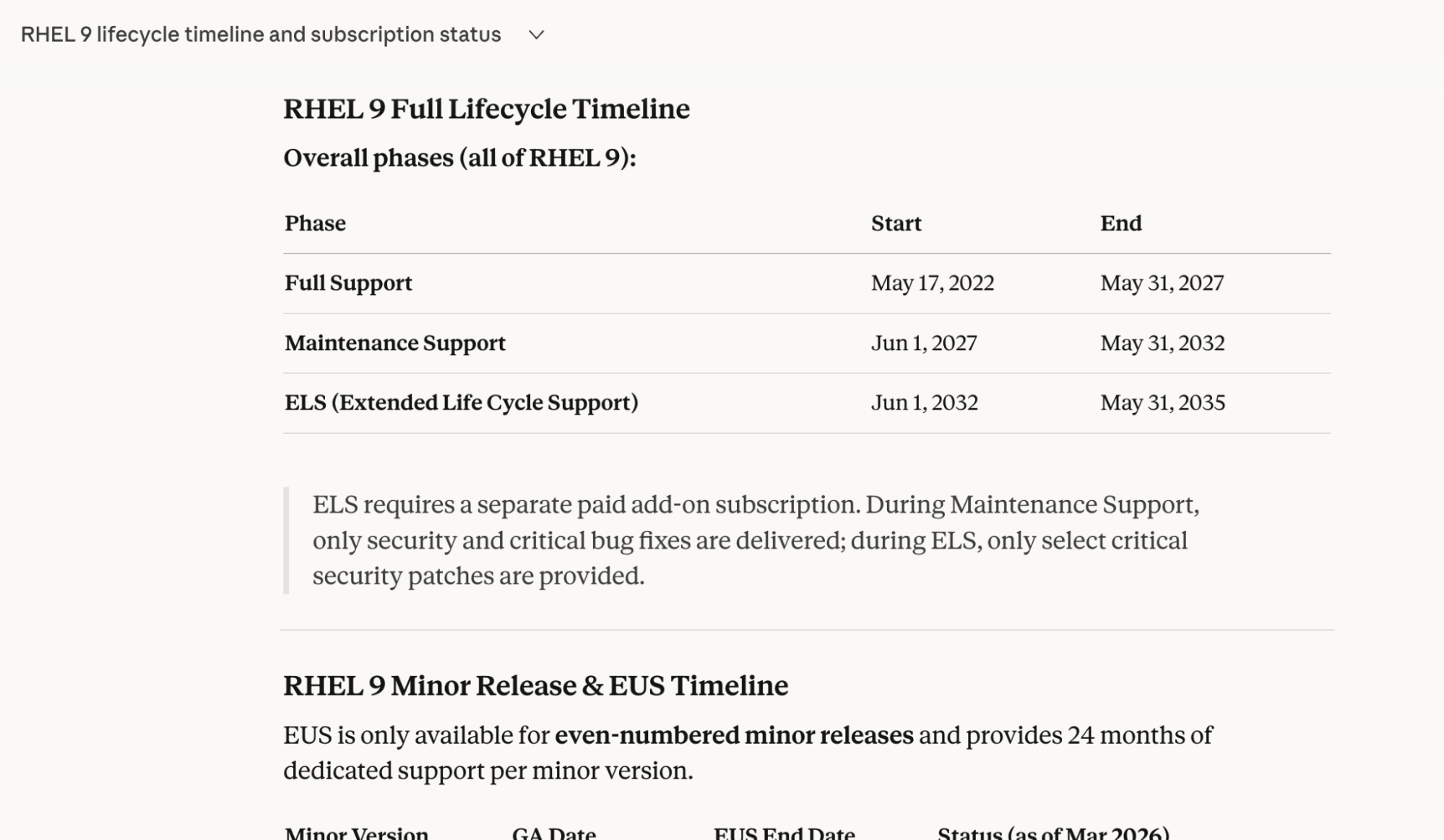 "Show me the full lifecycle timeline for RHEL 9, including EUS and ELS dates, and identify which one of my systems is currently subscribed to these versions."