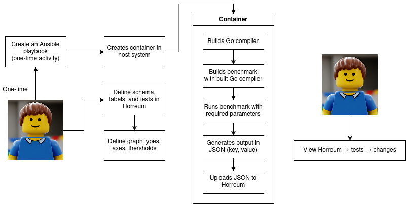 The framework requires three one-time setup tasks when initially configured. Each Ansible execution automatically uploads data to Horreum and refreshes plots. The complete process is illustrated in the flowchart in Figure 1.