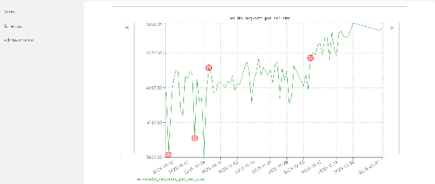 Horreum flags data points exceeding thresholds, which show up on the graph as red dots, as shown in Figure 2. You can hover over flagged points to retrieve run IDs and investigate anomalies.