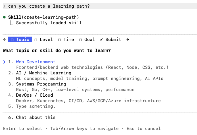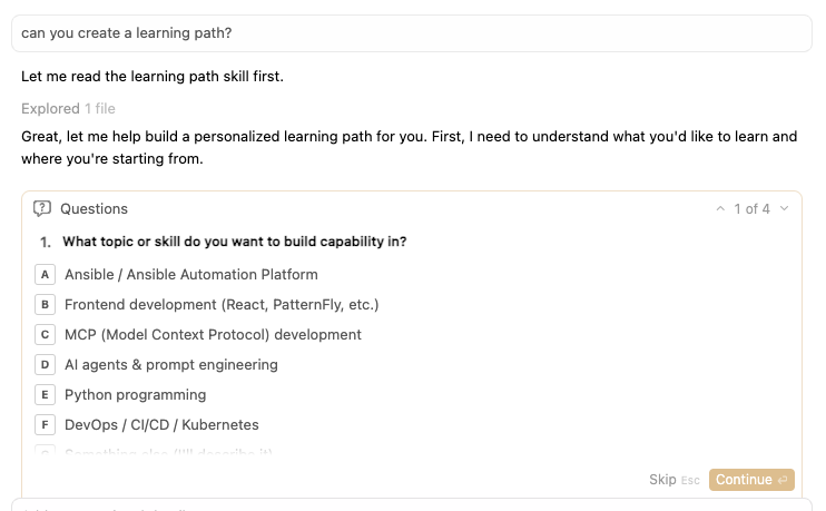 Then, trigger the create-learning-path skill with a prompt matching its metadata, as shown in Figure 2.