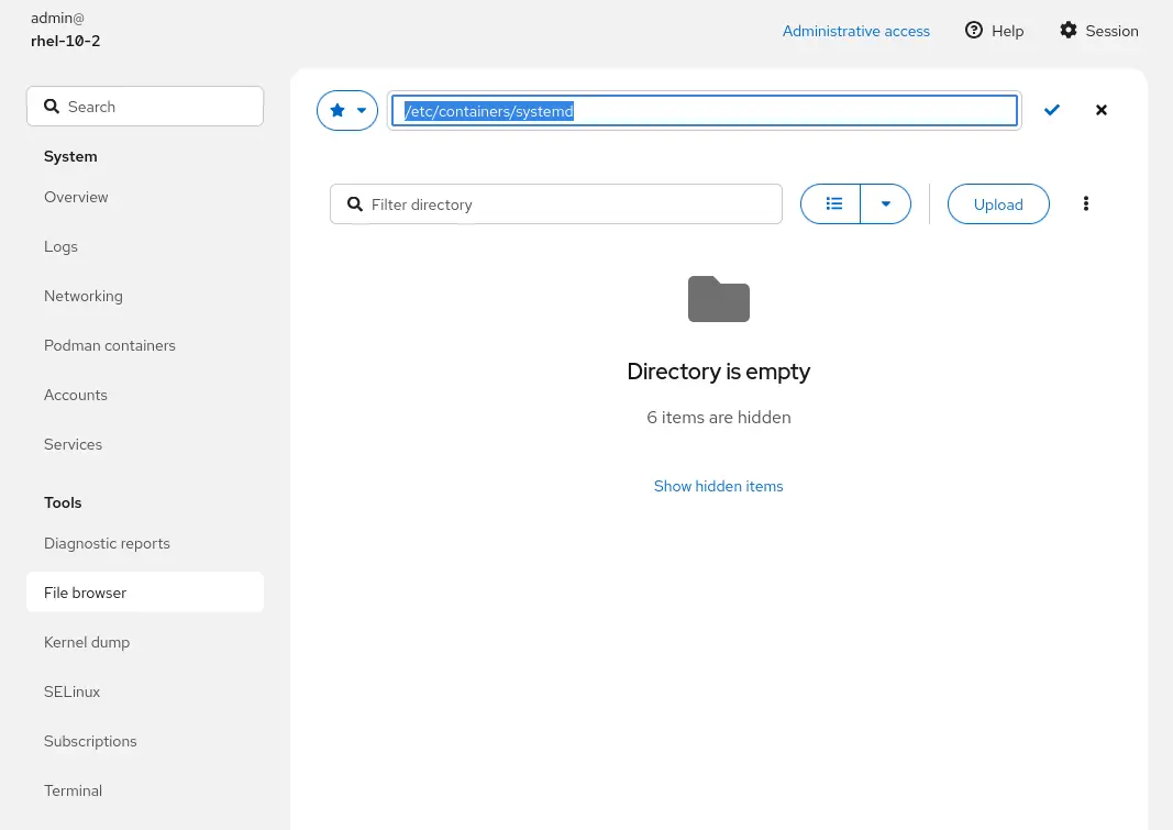 Click on the File browser under Tools and browse to /etc/containers/systemd/. To change the path using text input, click on the pencil icon next to Favorites (as in Figure 1).
