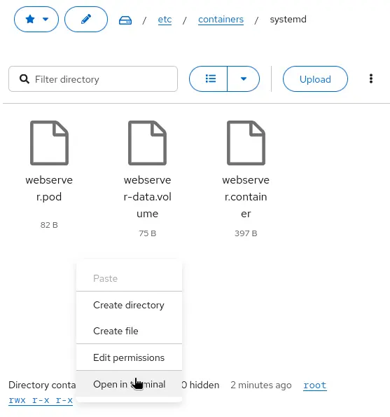 WantedBy=default.targetOnce the files are there, we need to reload the systemd units. The web console doesn't have a button for this, but the terminal page provides you with everything you need. Right-click on the directory pane, or click the "kebab" (3 vertical dots) menu to open the terminal page in the current directory, as in Figure 3: