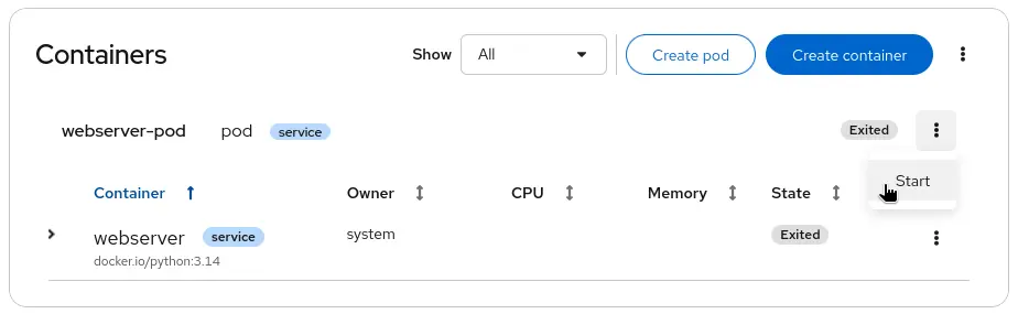 $ sudo systemctl daemon-reloadThe quadlets are now available and visible in the Cockpit Podman plug-in for easy management. Open the cockpit-podman page to verify that it now displays your new pod, as in Figure 4. Select Start from the kebab menu to start the pod.