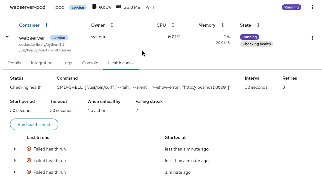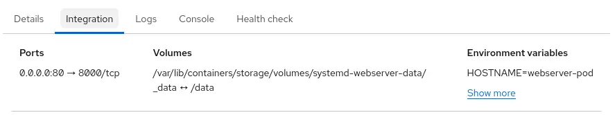The health check fails because the web server doesn't serve anything (or rather, it serves an empty podman volume). The web console currently doesn't support listing volumes, but the volume is listed in the Integration tab (Figure 7):