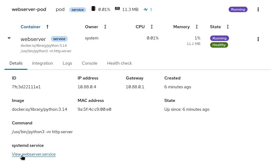 Podman Quadlet containers are fully integrated in the Services, Metrics, and Logs pages of the web console. The Details tab has a direct link (at the bottom of the page, as in Figure 7) to the Service page, where you can see the logs and the systemd unit status.